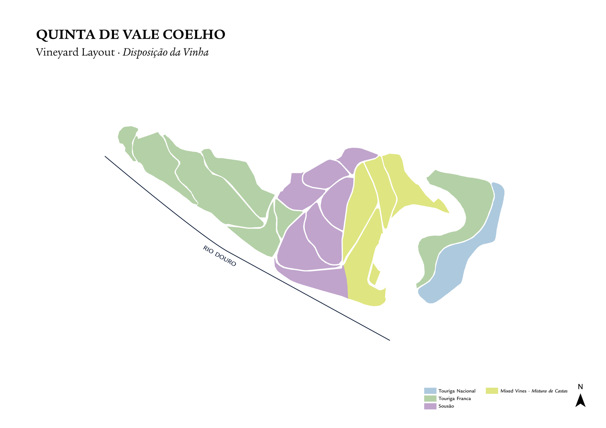 Vale Coelho retains a high proportion of old mixed varieties, although nearly half of the plantings are Touriga Franca, a variety which is well-suited to the predominantly southwest-facing aspect of the property.